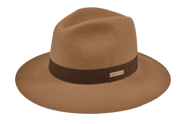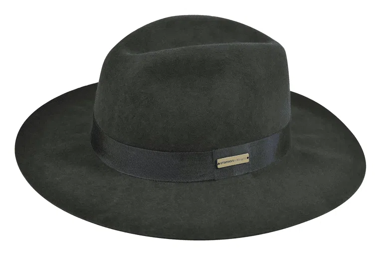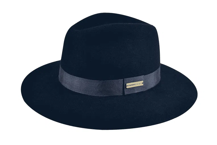 Μάλλινη Fedora Stamion 1003 σε 4 διαφορετικές αποχρώσεις με ραμμένη διακοσμητική κορδέλα και μεταλλικό ταμπελάκι με το λογότυπο του κατασκευαστή πάνω σε αυτή. Σύνθεση 100% μαλλί, κατασκευάζεται στην Ελλάδα απο την Stamion Accessories 1914 με εξαιρετική ποιότητα κατασκευής και αποτελεί την Premium Winter 2024 συλλογή της εταιρείας.