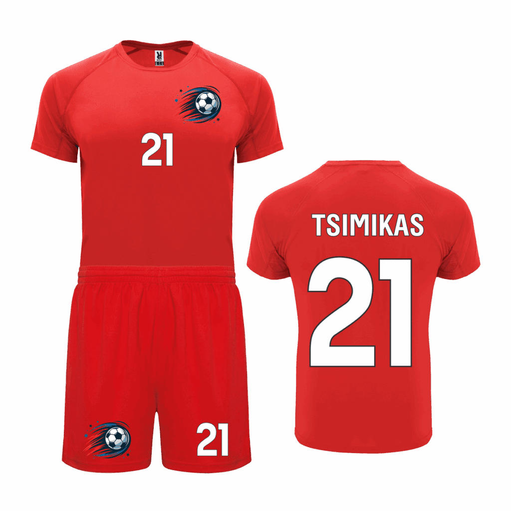 Σετ ποδοσφαίρου Τσιμίκας σε κόκκινο χρώμα για ηλικίες από 4 έως και 16 ετών από 100% πικέ πολυεστέρα 135g/m². Συμβουλευτείτε το μεγεθολόγιο στην γκαλερί φωτογραφιών του προϊόντος. Κοντά μανίκια, πλαϊνές ραφές, μανικοκόλληση, στρογγυλή λαιμόκοψη και γρήγορο στέγνωμα. Αναπνέον ύφασμα, τεχνικό μπλουζάκι και σορτς με κορδόνια σύσφιξης, εξαιρετική ποιότητα κατασκευής. Το σετ περιλαμβάνει την μπλούζα και το σορτσάκι.