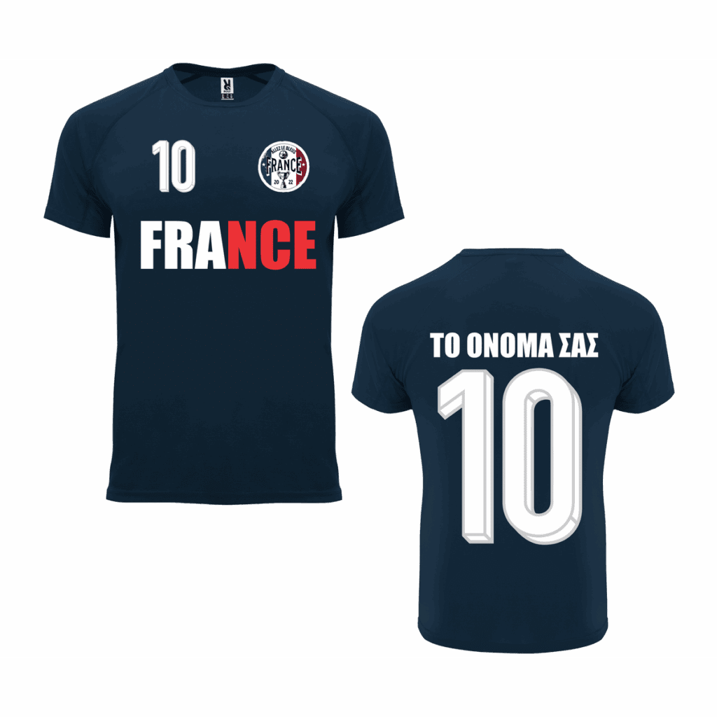 Μπλούζα ποδοσφαίρου France σε σκούρο μπλε χρώμα για ηλικίες από 4 έως και 16 ετών από 100% πικέ πολυεστέρα 130g/m². Συμβουλευτείτε το μεγεθολόγιο στην γκαλερί φωτογραφιών του προϊόντος. Κοντά μανίκια, πλαϊνές ραφές, μανικοκόλληση, στρογγυλή λαιμόκοψη και γρήγορο στέγνωμα. Δυνατότητα προσθήκης του ονόματος σας και του αριθμού επιλογής σας (προσθέστε τα στα σχόλια της παραγγελίας σας στο καλάθι αγορών – απαιτείται πληρωμή με κάρτα). Αναπνέον ύφασμα, τεχνικό μπλουζάκι, εξαιρετική ποιότητα κατασκευής.