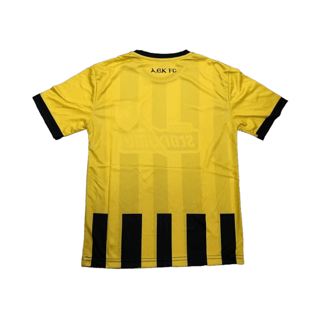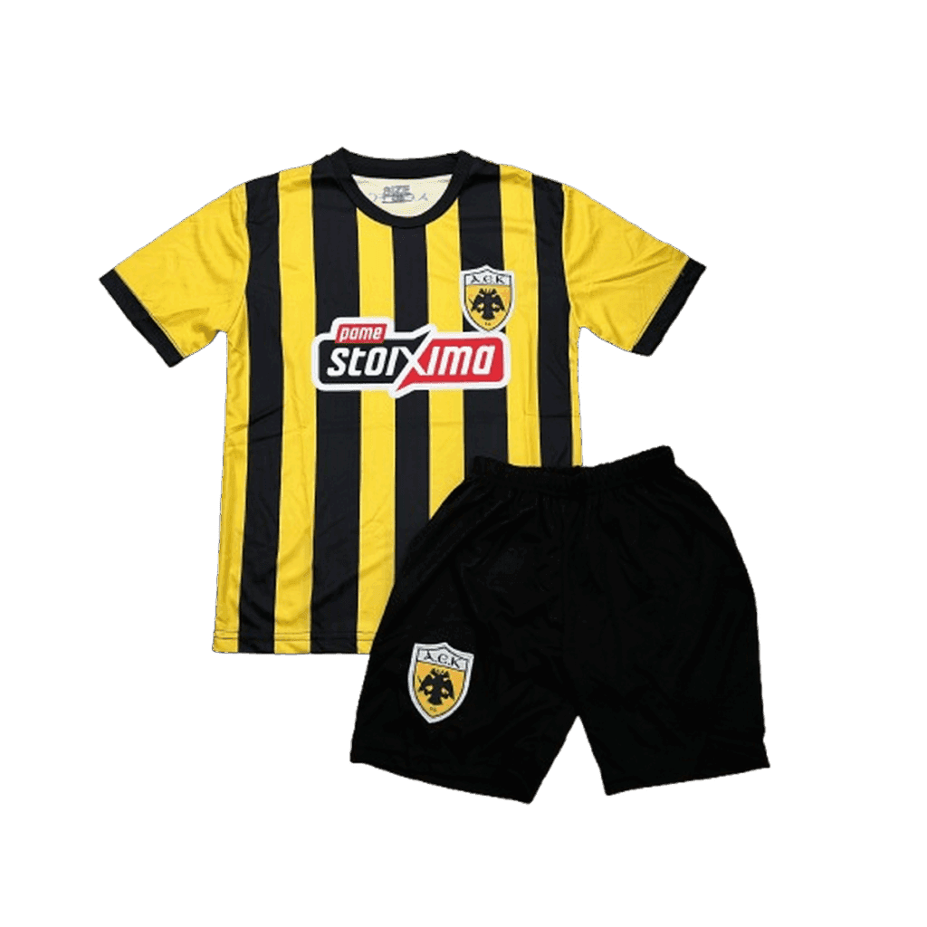 Παιδικό σετ ποδοσφαίρου ΑΕΚ εντός έδρας εμφάνιση σε κιτρινόμαυρο χρώμα με μαύρο σορτς. Το σετ περιλαμβάνει τη μπλούζα και το σορτσάκι. Τα μεγέθη αντιστοιχούν στην ηλικία του παιδιού. Συμβουλευτείτε το μεγεθολόγιο στη συλλογή εικόνων του προϊόντος. Εξαιρετική ποιότητα κατασκευής.