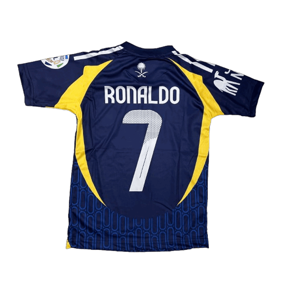 Παιδικό σετ ποδοσφαίρου Ronaldo Al Nassr εκτός έδρας εμφάνιση σε σκούρο μπλε χρώμα. Το σετ περιλαμβάνει τη μπλούζα και το σορτσάκι. Συμβουλευτείτε το μεγεθολόγιο στη συλλογή εικόνων του προϊόντος. Εξαιρετική ποιότητα κατασκευής.