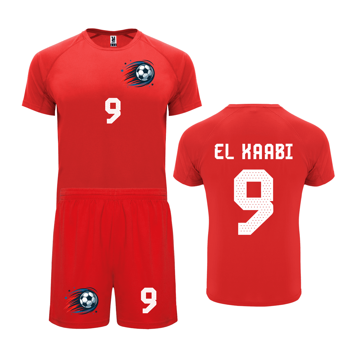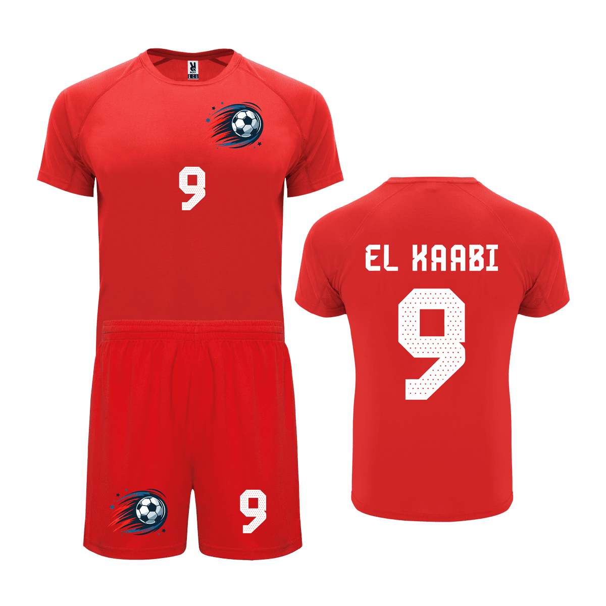 Σετ ποδοσφαίρου El Kaabi σε κόκκινο χρώμα για ηλικίες από 4 έως και 16 ετών από 100% πικέ πολυεστέρα 135g/m². Συμβουλευτείτε το μεγεθολόγιο στην γκαλερί φωτογραφιών του προϊόντος. Κοντά μανίκια, πλαϊνές ραφές, μανικοκόλληση, στρογγυλή λαιμόκοψη και γρήγορο στέγνωμα. Αναπνέον ύφασμα, τεχνικό μπλουζάκι και σορτς με κορδόνια σύσφιξης, εξαιρετική ποιότητα κατασκευής. Το σετ περιλαμβάνει την μπλούζα και το σορτσάκι.