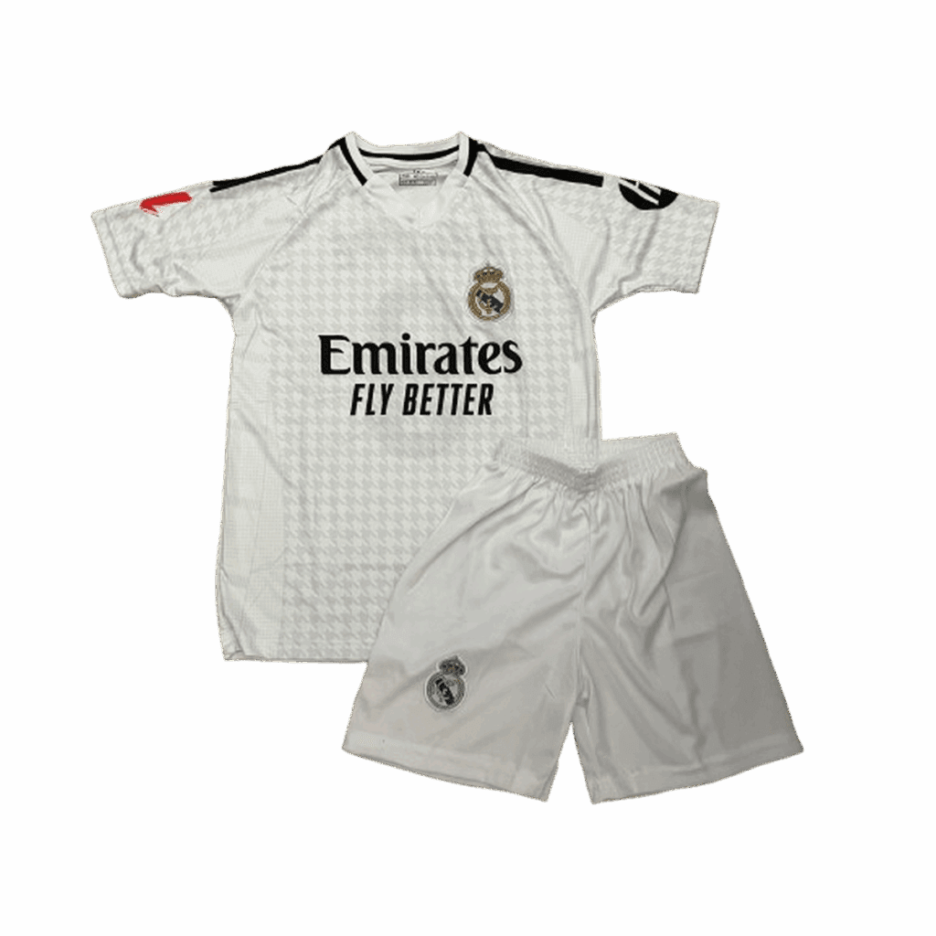 Σετ ποδοσφαίρου Mbappe Real Madrid εντός έδρας εμφάνιση σε λευκό χρώμα με λευκό σορτς. Το σετ περιλαμβάνει τη μπλούζα και το σορτσάκι. Τα μεγέθη αντιστοιχούν στην ηλικία του παιδιού. Συμβουλευτείτε το μεγεθολόγιο στη συλλογή εικόνων του προϊόντος. Εξαιρετική ποιότητα κατασκευής.