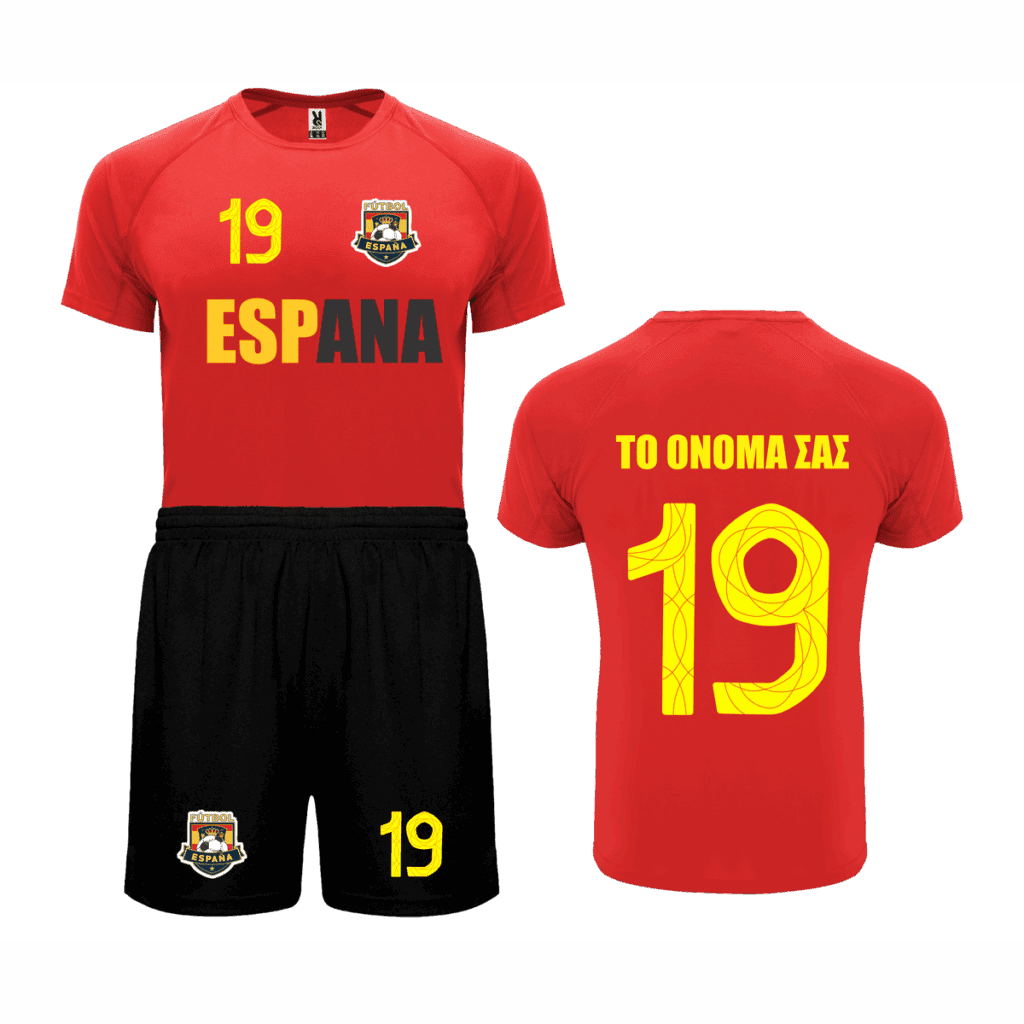 Σετ ποδοσφαίρου Spain για ηλικίες από 4 έως και 16 ετών από 100% πικέ πολυεστέρα 130g/m². Συμβουλευτείτε το μεγεθολόγιο στην γκαλερί φωτογραφιών του προϊόντος. Κοντά μανίκια, πλαϊνές ραφές, μανικοκόλληση, στρογγυλή λαιμόκοψη και γρήγορο στέγνωμα. Δυνατότητα προσθήκης του ονόματος σας και του αριθμού επιλογής σας (προσθέστε τα στα σχόλια της παραγγελίας σας στο καλάθι αγορών – απαιτείται πληρωμή με κάρτα). Αναπνέον ύφασμα, τεχνικό μπλουζάκι και σορτς με κορδόνια σύσφιξης, εξαιρετική ποιότητα κατασκευής. Το σετ περιλαμβάνει την μπλούζα και το σορτσάκι.