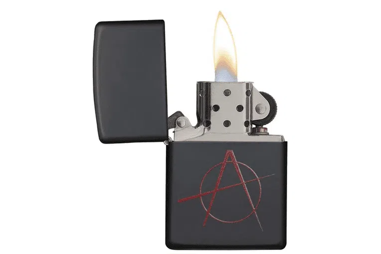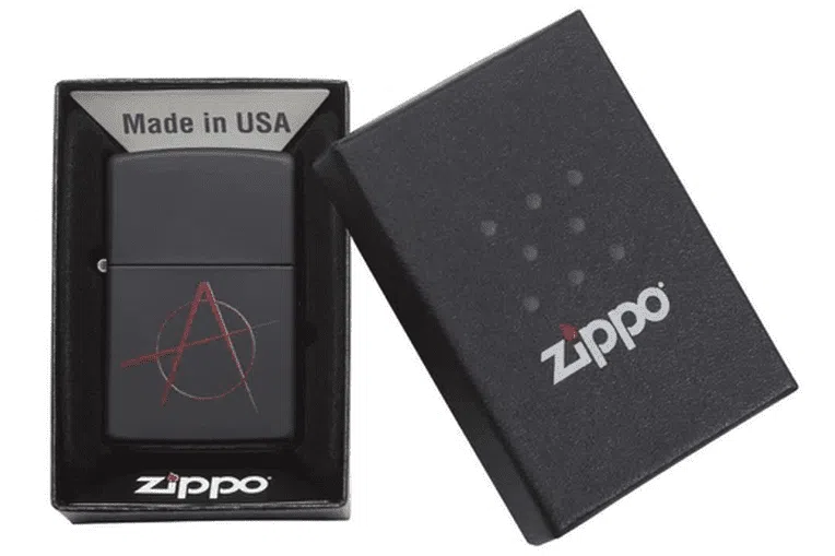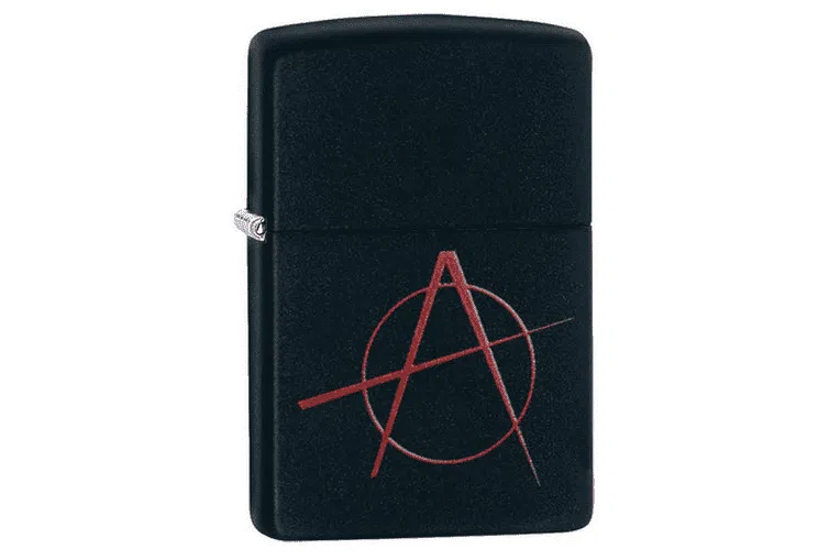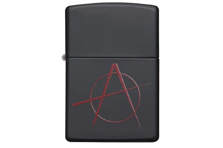 Anarchy Symbol Zippo. To σύμβολο της αναρχίας απεικονίζεται με κόκκινο χρώμα σε έναν μαύρο ματ αντιανεμικό αναπτήρα. Διατίθεται σε συσκευασία δώρου. Για βέλτιστη απόδοση, γεμίστε με υγρό αναπτήρων Zippo.
