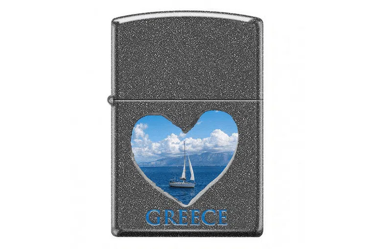 Greece Heart Ocean View. Κλασικός αναπτήρας Zippo με φινίρισμα Satin Chrome και απεικόνιση το μπλε της θάλασσας μέσα από το παράθυρο μιας καρδιάς.
