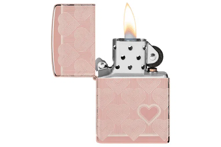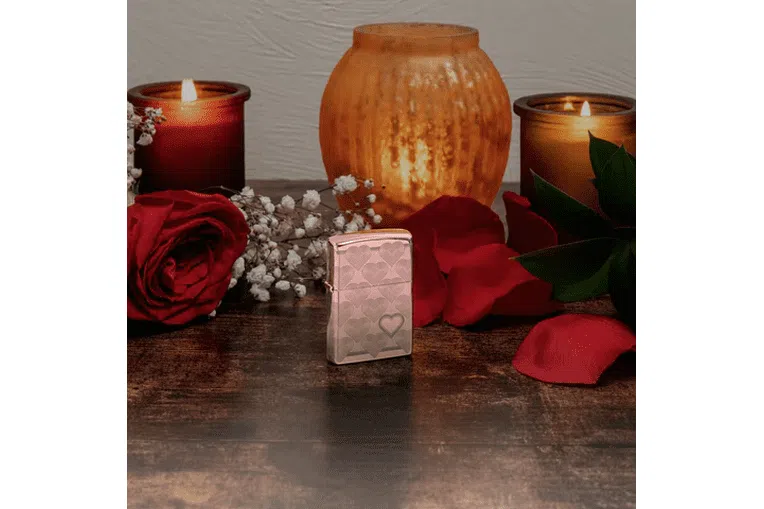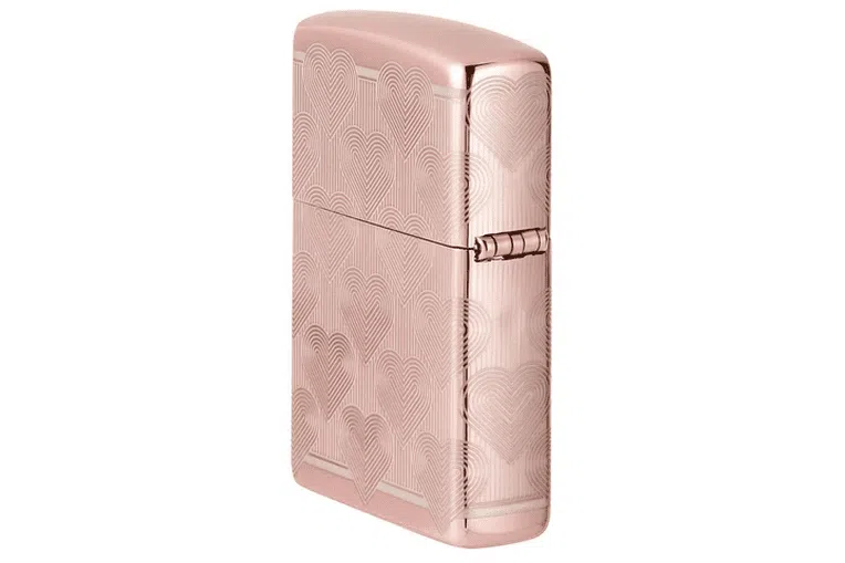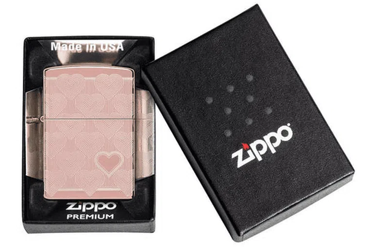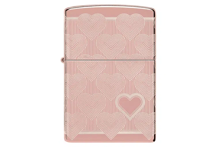Heart Design Zippo. Χαρίστε στην αγαπημένη σας – ή στον εαυτό σας – αυτόν τον πολυτελή και αξιαγάπητο αναπτήρα High Polish Rose Gold. Ο επαναλαμβανόμενος σχεδιασμός καρδιάς τυλίγει ολόκληρη την επιφάνεια χρησιμοποιώντας τη διαδικασία Laser 360° και διαθέτει μια τολμηρή καρδιά στην μπροστινή επιφάνεια του αναπτήρα. Διατίθεται συσκευασμένο σε συσκευασία δώρου. Για βέλτιστη απόδοση, γεμίστε με γνήσιο υγρό αναπτήρα Zippo.