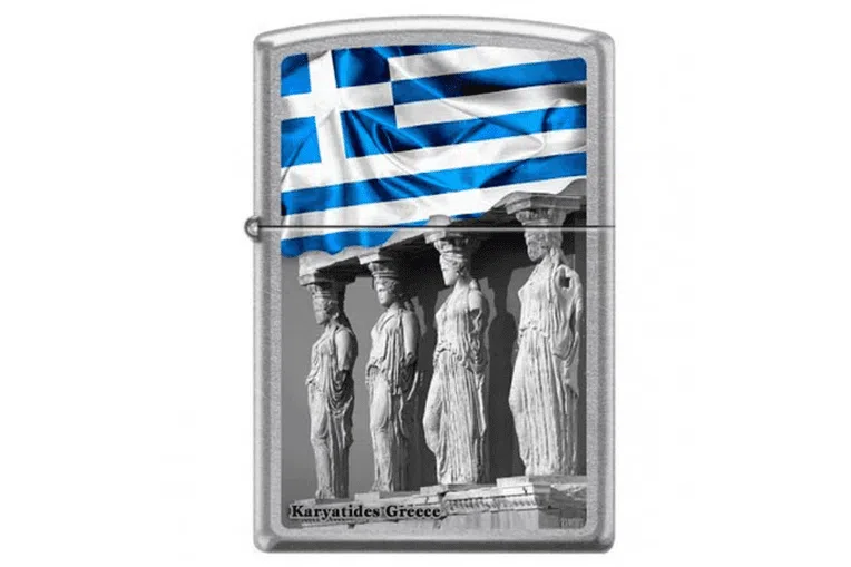 Κλασικός αντιανεμικός αναπτήρας Zippo με φινίρισμα Street Chrome που απεικονίζει τις Καρυάτιδες της Ακρόπολης & την κυματιστή ελληνική σημαία.