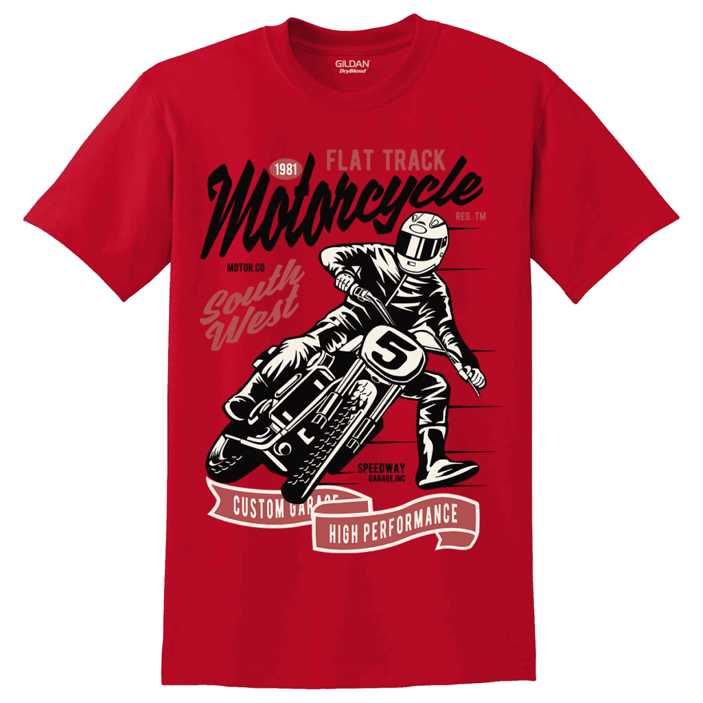 Unisex μπλούζα Flat Track Motorcycle σε 7 διαφορετικές αποχρώσεις απο 100% οργανικό Premium βαμβάκι τύπου Combed RingSpun σεμι-πενιέ 155 γραμμαρίων. Εφαρμοστή γραμμή, στρογγυλή λαιμόκοψη, χωρίς πλαϊνές ραφές. Προϊόν ψηφιακής ανεξίτηλης εκτύπωσης απευθείας πάνω στο ύφασμα με αδιάβροχα, ασφαλή και  πιστοποιημένα μελάνια OEKO-TEX 100 που προσφέρουν ζωντανά χρώματα, ασφάλεια και μεγάλη αντοχή στο πλύσιμο και στο χρόνο. Το σώμα σας αναπνέει κανονικά σε αντίθεση με τις στάμπες και υλικά Plastisol και το τύπωμα δεν το νοιώθεται καθόλου στο σώμα σας και δεν βαραίνει την μπλούζα. Συμβουλευτείτε το μεγεθολόγιο στο κάτω μέρος της σελίδας μας ή στις φωτογραφίες του προϊόντος. Εξαιρετική ποιότητα κατασκευής.
